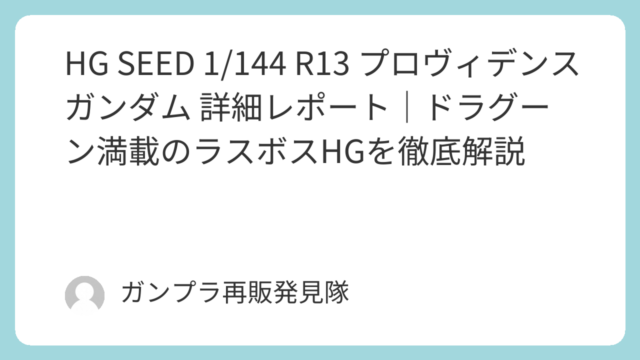 HG HG SEED 1/144 R13 プロヴィデンスガンダム 詳細レポート|ドラグーン満載のラスボスHGを徹底解説 HG SEED 1/144 R13 プロヴィデンスガンダムのレビュー記事。ドラグーンユニット、色分け、可動、付属武装、モデリングポイントまで詳しく解説。SEEDラスボス機体のHGキットの魅力を紹介します。 2026.03.18 HG機動戦士ガンダムSEED