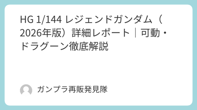 HG HG 1/144 レジェンドガンダム(2026年版)詳細レポート|可動・ドラグーン徹底解説 HG 1/144 レジェンドガンダム(2026年1月版)を徹底レビュー。SEEDアクションシステムの可動性能、ドラグーン展開ギミック、付属品、色分け、合わせ目、塗装ポイントまで詳しく解説します。 2026.02.26 HG機動戦士ガンダムSEED DESTINY